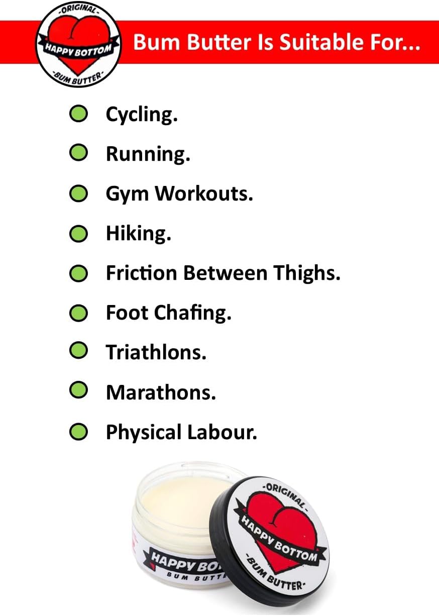 Say goodbye to chafing and hello to comfort!. Our Bum Butter is a game changer for all you amazing runners out there! #Perfect for those long runs, it’s a must-have for your training routine. Soft, smooth, and oh-so-effective—your skin will thank you! Apply some on your skin for a Happy Bottom whilst cycling or running. Bum Butter is made from natural vegan ingredients – no nasty petrochemicals. Antiseptic and anaesthetic. Reduces risk of infection. Reduces friction. Also great as a lip balm, but don’t double dip! Used by cyclists, walkers, surfers, runners, climbers, triathletes, wild swimmers and sweaty chefs. Handmade in the UK.